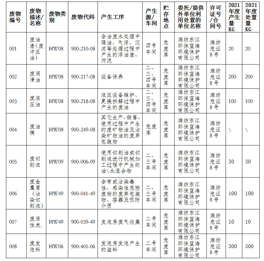 2021年危險廢物產生量為760kg,貯存760kg,處理危險廢物760kg,年底庫存量0kg。其中廢油渣(廢沖壓油)(HW08)20噸、廢潤滑油(HW08)200kg、廢液壓油(HW08)100kg、廢切削液(HW09)30kg、廢金屬屑(沾染切削液)(HW49)100kg、廢活性炭(HW49)10kg、廢發泡料(HW06)300kg。