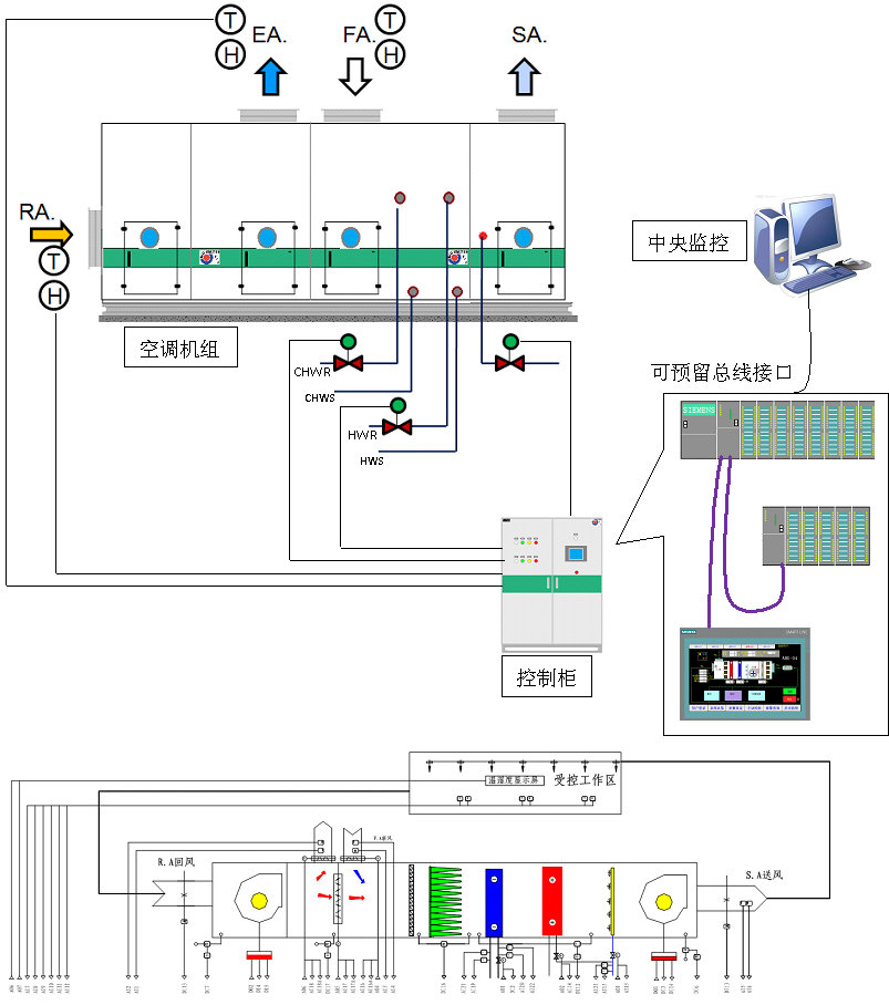 工業人工環境控制解決方案 功能 1.送回風溫濕度實時監測;新排風溫濕度實時監測;室內溫濕度檢測(多點); 2.送回風機運行狀態監測; 3.風閥開度實時監測; 4.冷熱水、加濕閥、電加熱、蒸汽加熱閥開度控制及其監測; 5.送回風機啟停及變頻調速; 6.全年多焓值節能分區控制; 7.過濾器臟堵報警、缺風保護、高低壓報警、消防連鎖; 靈活的硬件配置以及獨特的控制算法 可根據用戶的要求和不同的應用場合使用不同的控制器以滿足恒溫恒濕的需要。 針對不同類型的空調及熱濕處理方案,靈活采取最優控策略; 采用多種優化控制算法(如:改進型PID、模糊調節、抑制積分飽等); 返回列表 打印 分享 上一篇T2018-07-20上一篇:集中監控系統解決方案 下一篇T2018-07-20下一篇:醫療潔凈控制解決方案